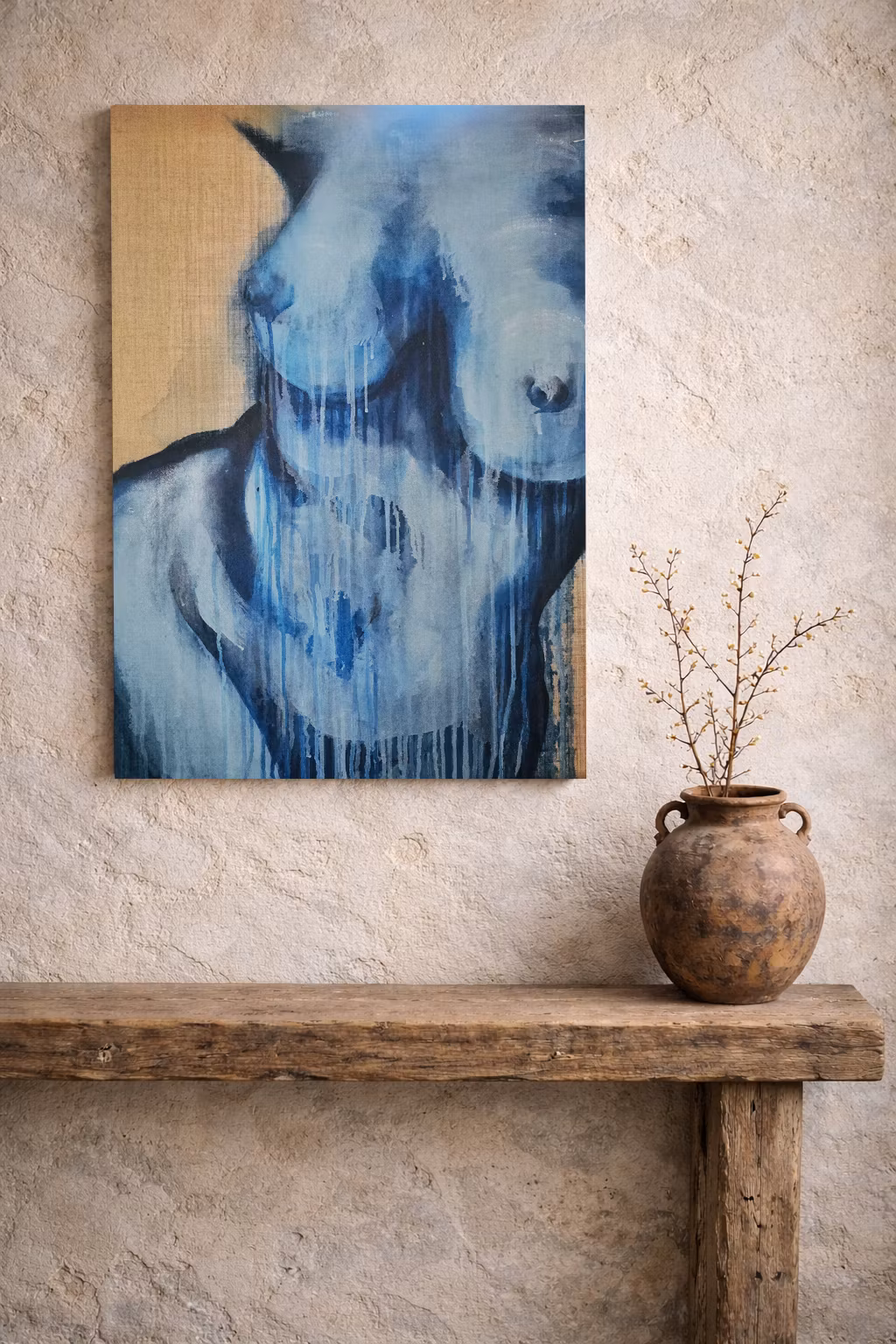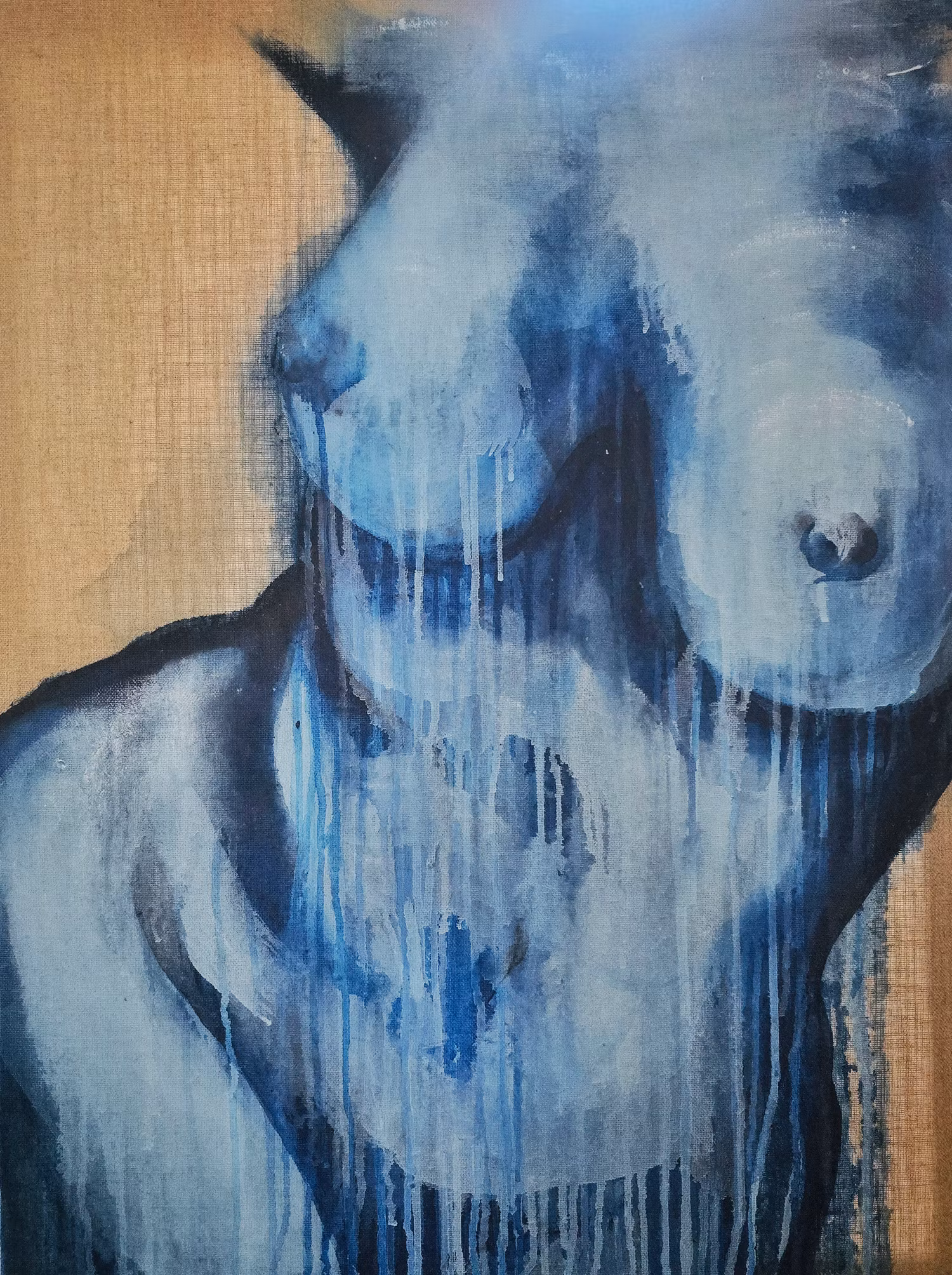 "Ocean Soul" från kollektionen 'Whispers of Her' är en abstrakt tolkning av kvinnokroppen, kraftfull, rå och verklig. Flytande penseldrag och droppande texturer blandar blåa nyanser.
